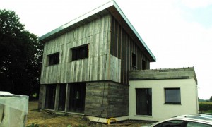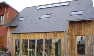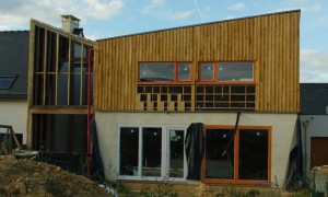 Lieu : St Gilles(35) – 2012 Une maison en ossature bois « douglas », avec une insufflation en ouate de cellulose, et panneau extérieur isolant en fibre de bois, étanchéité de toiture en membrane Epdm, menuiserie bois triple vitrage, plancher phonique entre rdc et étage. Une dalle en terre crue et un mur de btc pour l’inertie. Pose du bardage châtaignier