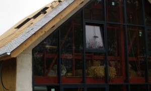 Lieu : St Senoux (35) – 2009 Une maison en paille porteuse (Nebraska), avec une charpente en chevron porteur pour, également, un remplissage en petite botte de paille en toiture. Un mur porteur en pisé et une dalle en terre crue pour l’inertie, ainsi qu’une façade sud entièrement vitré pour réduire ses besoin de chauffage. pose des bottes de paille