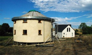 Lieu : Guipry (35) – 2009 / 12 Construction d’une maison en paille porteuse ronde sur pilotis métallique et toiture végétale.