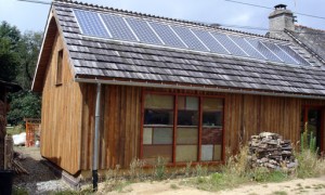Lieu : Messac (35) – 2007 Une extension accolée à une longère en pierre, avec une en ossature bois (pin douglas) et un remplissage en petites bottes de paille. Tous les enduits sont en terre crue intérieur et extérieur, avec un bardage en mélèze sur les façades les plus exposées Dalle en terre crue + chape maigre (chaux / sable) + terre cuite Différent type de mur de masse: en […]